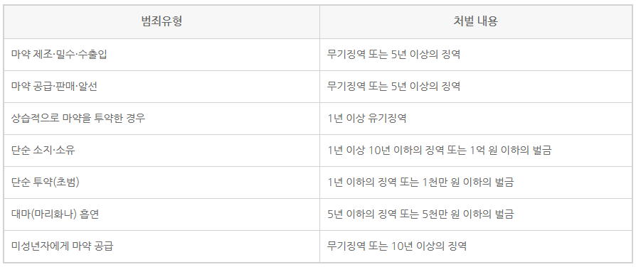 마약범죄는 범죄유형에 따라 처벌 내용이 다른데, 각 유형별 처벌 내용은 아래와 같습니다.
